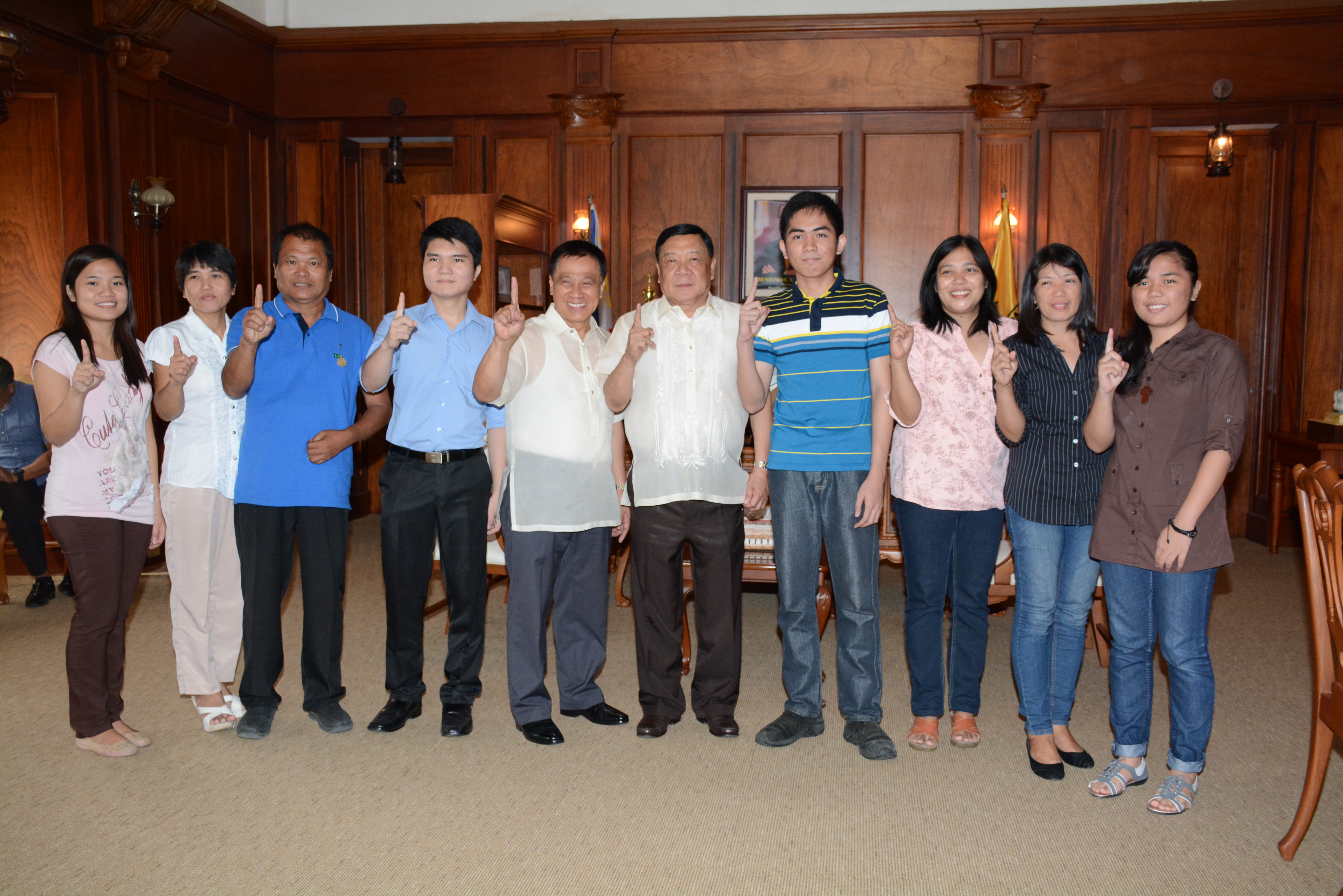 GOV. ESPINO FETES CPA BOARD EXAM TOPNOTCHER AND 8TH PLACER FROM PANGASINAN. Governor Amado T. Espino, Jr. (5th from right) flash the Pangasinan number one sign with Ralley S. Paragas (4th from left), the topnotcher of the recent examination for Certified Public Accountants (CPAs) given by the Professional Regulations Commission (PRC) and Fern Adriel Velasco (4th from right), an academic scholar of the provincial government who placed 8th in the said exam. Also present during a courtesy call on the Governor held on November 3 are: Colegio De Dagupan (CDD) President Voltaire Arzadon (5th from left), Dr. Teofila Albay (3rd from right), Dean of CDD’s School of Business and Accountancy, and parents and siblings of Paragas and Velasco. /Photo by TQuimson