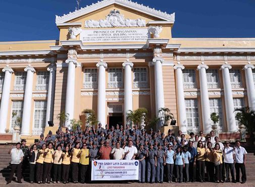 PMA CLASS 2016 HOLDS IMMERSION PROGRAM IN PANGASINAN. With the Capitol Building serving as the backdrop, Gov. Amado T. Espino, Jr., Vice Gov. Jose Ferdinand Calimlim, Jr., Board Member Danilo Uy (all at the center) and some department heads of the provincial government join the 65- member team of Gabay-Laya Batch 2016 of the Phil. Military Academy (PMA) in flashing the symbolic No. 1 sign. Cadets of Gabay-Laya Batch 2016 have chosen Pangasinan as the venue of their three-day Cadet Immersion Program: Aksyon at Gawaing Bayanihan 2015 (CIPAG Bayanihan 2015) from November 16 to 18. The cadets held series of activities in selected sites like in the towns of Lingayen, Bugallon, Labrador, Binmaley and Bolinao to conduct book donations, information drive, coastal clean-up, and mangrove planting. (Photo by Meinard Sadim)