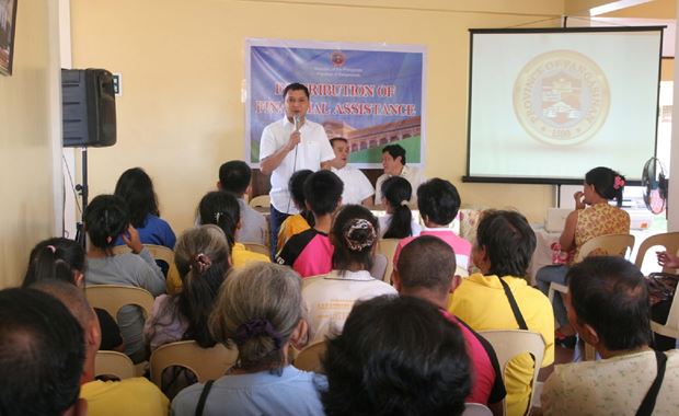 CASH ASSISTANCE TO FAMILIES OF ‘LANDO’ FATALITIES. Board Member and Liga ng mga Barangay Provincial President Amado “Pogi” I. Espino III (standing) urges the families of the 14 fatalities of Typhoon Lando’s onslaught last October to stand firm despite their loss. Each family received financial assistance worth P10,000 as a manifestation of support from the provincial government. Coinciding with the distribution was the awarding of cash assistance amounting to P60,000to some 12 Children WithDisabilities (CWDs) who are enrolled at the Special Education (SPED) Center in Bautista town.The distribution ceremony was held last December 7 at the Crisis Intervention Center of the Provincial Social Welfare and Development Office (PSWDO). Joining BM Espino during the event were Vice Governor Jose Ferdinand Z. Calimlim, Jr. and PSWDO chief Emilio Samson (both seated). (PIO photo)