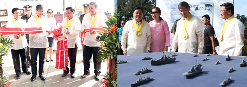 LINGAYEN GULF LANDINGS EXHIBIT. Governor Amado T. Espino, Jr. (2nd from right, left photo) and Lt. Gen (Ret.) Ernesto G. Carolina, Philippine Veterans Affairs Office (PVAO) Administrator (2nd from left, left photo) lead the ribbon-cutting ceremony of the Lingayen Gulf Landings Exhibit which features a miniature collection of the Lingayen Gulf Landings fleet (right photo). Assisting during the ribbon-cutting were: National Defense Undersecretary Jesus Millan (extreme left, left photo) and Vice Governor Jose Ferdinand Calimlim, Jr. (extreme right, left photo). At the back (left photo) are: (from left to right): Maj. Gen. Angelito De Leon, 7th Infantry ID Commander of Philippine Army; Provincial Tourism and Cultural Affairs Officer Maria Luisa Elduayan; and Col. David Diciano, 702nd Infantry Battalion Commander of Philippine Army. The exhibit was opened for public-viewing on the western side of the Veterans’ Memorial Park, but was later transferred to the Pangasinan Training and Development Center. /Photo by MVSadim/SReyes