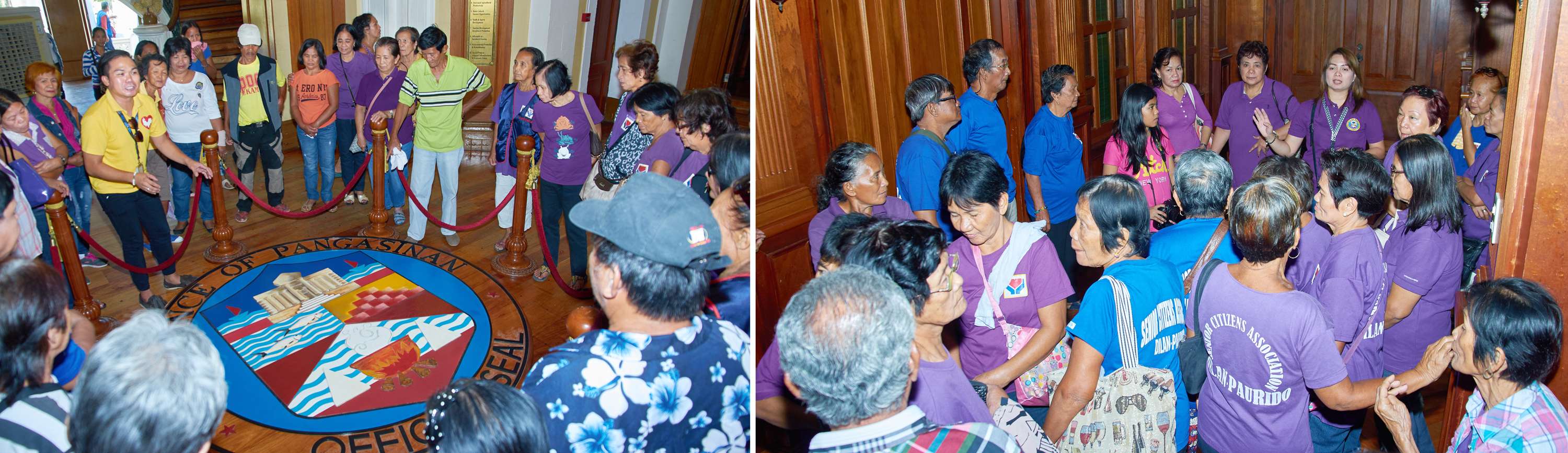CAPITOL HERITAGE TOURCAPITOL HERITAGE TOUR. Three groups of visitors—Senior Citizens Association of Brgy. Perez and Bry. Payapa, in San Carlos City; Senior Citizens Association of Brgy. Bayaoas and Brgy. Dilan, Urdaneta City and Cooperative and Farmers Association of Alcala are assisted by Capitol tour guides as they went around the Capitol building on January 20. Totaling around 500, the three groups also visited the Urduja House and Sison Auditorium as part of their Capitol Heritage Tour sponsored by the provincial government upon the request of their respective leaders. They were also treated with trips to the Manaoag Shrine, bagoong factory and provincial government facilities outside the Capitol Complex. The Capitol Heritage Tour is a pet project of Gov. Amado T. Espino, Jr. that aims to boost local tourism among Pangasinenses which is anchored on instituting ‘love’ for the province. (Photo by DesManaois)