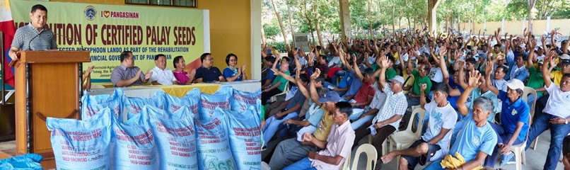 DISTRIBUTION OF CERTIFIED PALAY SEEDS TO PANGASINAN FARMERS. Board Member and Liga ng mga Barangay Provincial President Amado “Pogi” Espino, III (left photo) explains to Pangasinan farmers affected by typhoon Lando’s devastation in October last year (right photo) that the distribution of about 4,100 bags of certified palay seeds forms part of the provincial government’s rehabilitation efforts to help farmers recover from their losses because of the typhoon. Other resource speakers in the event include: Governor Amado T. Espino, Jr.; Vice Governor Jose Ferdinand Z. Calimlim, Jr.; Dr. Jeremy Agerico “Ming” Rosario, come-backing fourth district board member; and Dalisay Moya, OIC – Provincial Agriculturist. /Photo by DManaois
