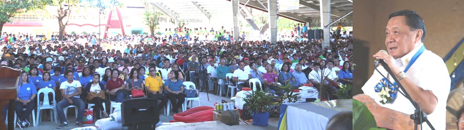 PANGASINAN FARMERS’ FORUM IN UMINGAN. Governor Amado T. Espino, Jr. (right photo) exhorts about 3,000 farmers from various farming communities in Pangasinan (left photo) during the Pangasinan Farmers’ Forum at the Umingan Municipal Auditorium on January 26, stressing that infrastructure projects, particularly farm-to-market roads, implemented by his administration mostly in Umingan and other towns in the sixth district contribute to the increase of agricultural productivity of Pangasinan farmers. The farmers’ forum was also attended by Department of Agriculture (DA) Secretary Proceso J. Alcala, DA – OIC Regional Director Valentino Perdido, Umingan Mayor Eldred Tumbocon, Balungao Mayor Philip Peralta, OIC – Provincial Agriculturist Dalisay Moya and Assistant Provincial Agriculturist Nestor Batalla. /Photo by MVSadim