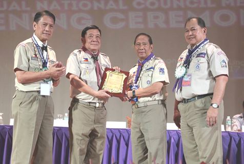 BSP Nat’l Council Meeting. Governor Amado T. Espino, Jr. (2nd from left) receives a certificate of recognition from Vice President and BSP National President Jejomar Binay (2nd from right) for his invaluable support to all endeavors of the Boy Scouts of the Philippines (BSP). The awarding was held on February 17 at the Sison Auditorium during the opening program of the three-day 60th Annual BSP National Council Meeting participated in by some 802 scout executives and representatives from all over the country. The BSP national convention, which is the first to be held in Ilocos Region, was dubbed as the most-attended annual event of BSP executives having gathered the biggest delegation with some 105 participating councils out of the 121 total councils nationwide. Aside from this, Gov. Espino was among the 537 outstanding scouters who were given special awards by the council. Assisting the Vice President, were former Bulacan Governor Roberto Pagdanganan, BSP Senior Vice President (left) and Atty. Wendel Avisado, BSP National Secretary General (right). (Photo by Meinard V. Sadim/rrb)
