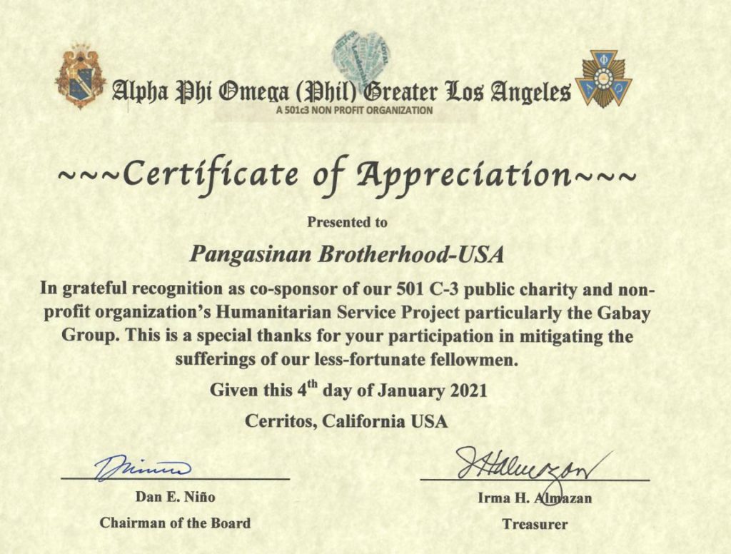 Per your request, I’m e-mailing you the Certificate of Appreciation from Alpha Phi Omega (Philippines) of Greater Los Angeles to Pangasinan Brotherhood-USA as our partner in grateful recognition as co-sponsor of our 501 C-3 public charity and non-profit organization’s Humanitarian Service Project particularly the Gabay Group. This is a special thanks for your participation in mitigating the sufferings of our less-fortunate fellowmen through your donations.