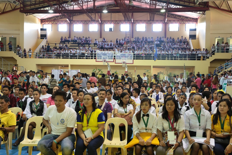 “LOVE PANGASINAN” BM ESPINO TELLS STUDENTS. Board Member and Liga ng mga Barangay Provincial President Amado “Pogi” I. Espino, III (left photo) urges about 2,000 student-participants (right photo) who participated in the 2nd Pangasinan Skills Competition last September 22 at the Narciso Ramos Sports and Civic Center Gymnaisum in Lingayen to “love Pangasinan” as he stressed that tourism development does not only include skills enhancement but also the development of love for our province.  /MVSadimim