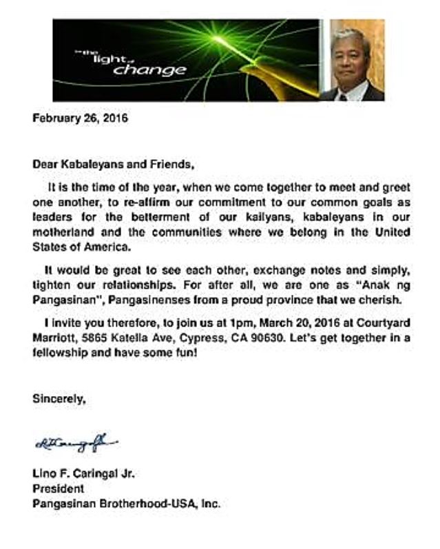Make this Sunday a leisure day for you.  Come and  “CAUCUS” with us.  Witness the new and enhanced image of Pangasinan Brotherhood-USA, Inc.  Be part and freely participate in the new forum of discussions as carefully formulated and planned by our dynamic officers.  President Lino Caringal Jr. in full tandem with his EVP Neil Estrada and Hospitality Chairman Bong Soriano will make sure that the meeting will run & finish the course as envisioned.