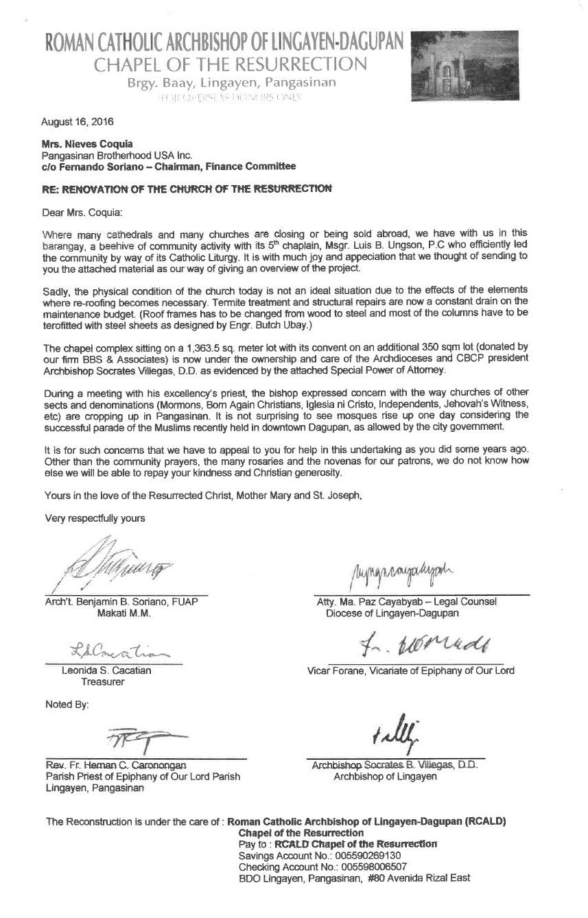 Villegas of Lingayen-Dagupan in the form of an appeal to help rebuild God’s House.