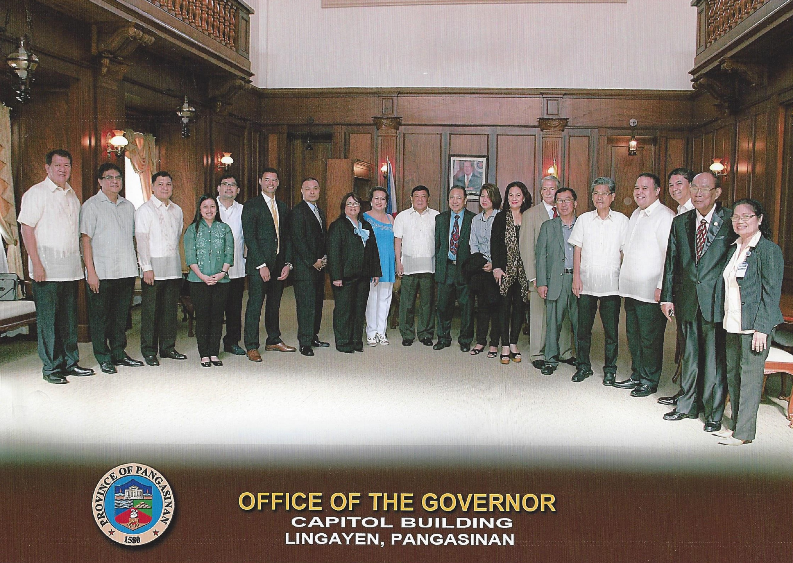 The Pangasinan Brotherhood, USA. Inc. came to pay a courtesy call to the Governor of Pangasinan, Governor Amado T. Espino, Jr. on January 7, 2015. The group of 25 was led by The First Lady Rhenee Ferrer, Virginia Coquia, Neil Estrada and Executive Vice-President Lino Caringal. Caringal assured continuing support and coordination with the local producers to further introduce and expose Pangasinan products in the US.